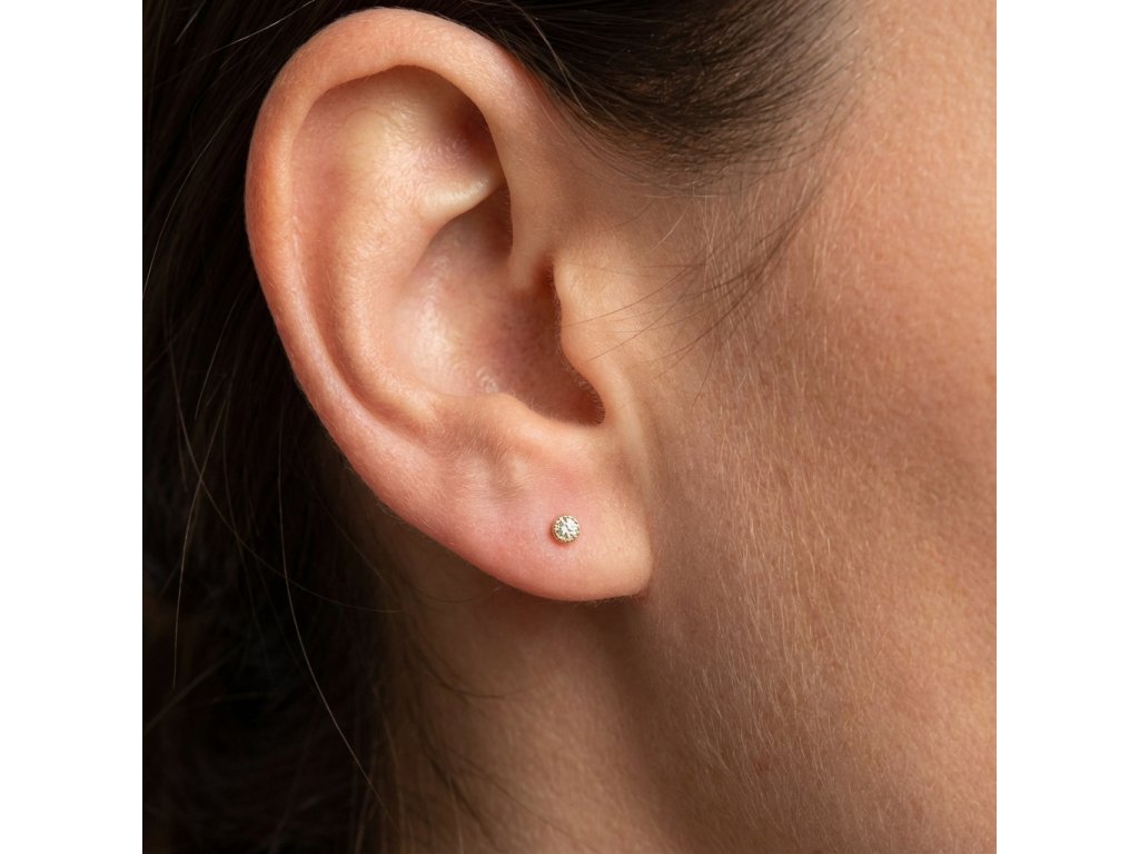 Drobné briliantové naušnice o průměru 2.4mm ve žlutém 14ti karátovém zlatě ryzosti 585/000 váha +/- 0.75g, puzetový zápon.