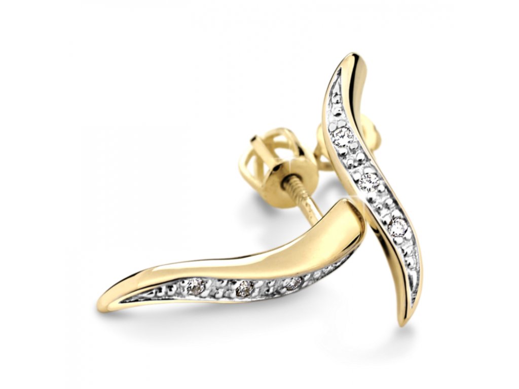 Zlaté dámské náušnice zdobené malými čirými zirkony v kombinaci žlutého a bílého 14ti karátového zlata ryzosti 585/1000 na šroubovací zápon. Rozměr ozdoby je 2.3x16mm, váha 1.82g.