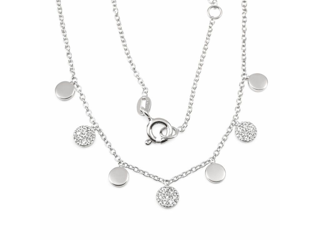 Zlatý dámský náhrdelník s ozdobami v bílém 14ti karátovém zlatě ryzosti 585/1000 o nastavitelné délce 42+3cm na zápon SK kroužek. Průměr kulaté ozdoby je 4.3mm, šíře řetízku anker 1mm, váha 2.94g.