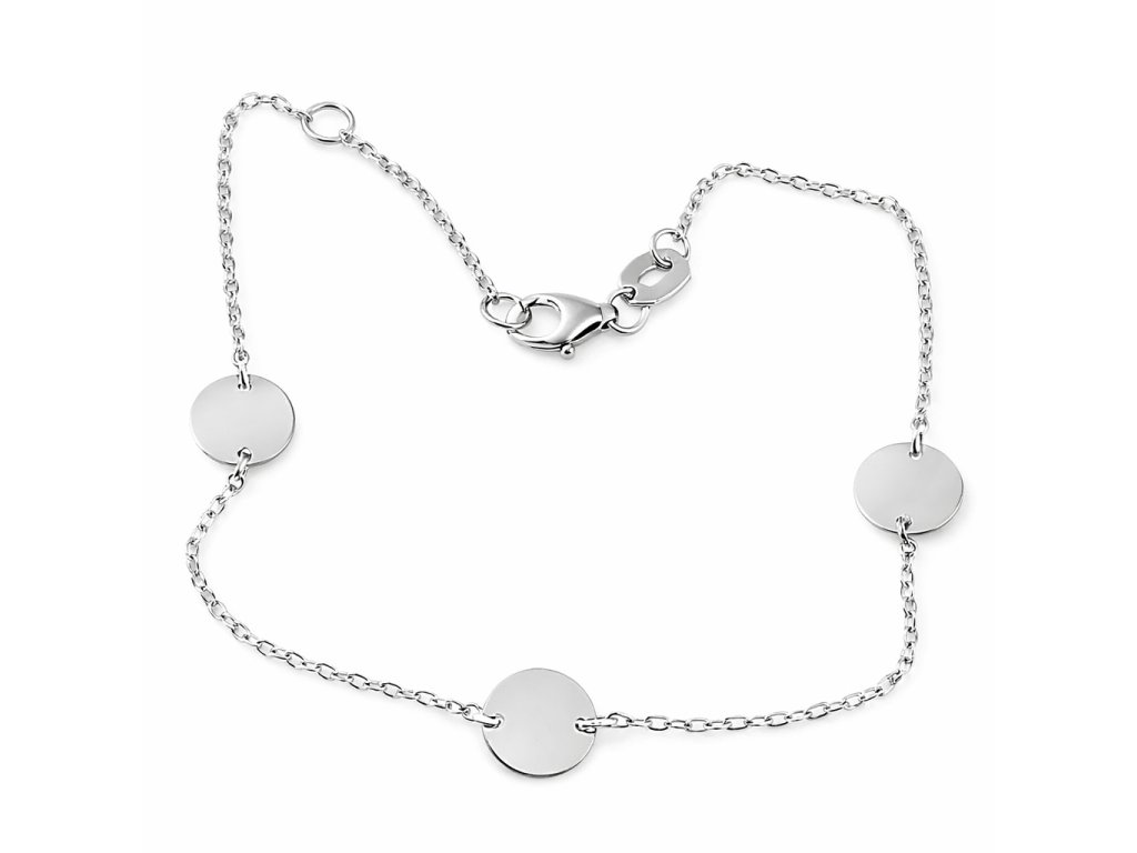 Zlatý řetízkový náramek s placičkami v bílém 14ti karátovém zlatě ryzosti 585/1000 o nastavitelné délce 17 a 19cm na karabinový zápon. Průměr ozdoby je 7mm, šíře řetízku 1.1mm, váha 1.35g.