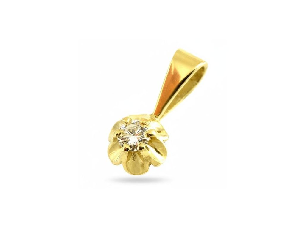 Zlatý přívěsek s briliantem ve žlutém 14ti karátovém zlatě ryzosti 585/1000. Průměr ozdoby je 6.0mm, celková délka 13mm, váha +/- 0.60g. Doporučujeme zakoupit náušnice do soupravy. (Řetízek není součástí šperku)