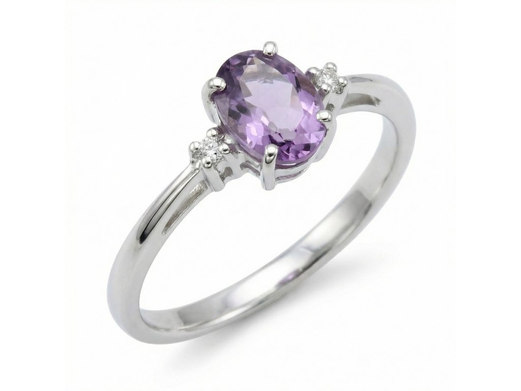 Zlatý prsten s ametystem (syntetickým) a bílými zirkony po stranách v bílém 14ti karátovém zlatě ryzosti 585/1000 ve velikosti 58. Rozměr kamene je 5x7mm, šíře spodní části prstenu – šíny 2.1mm, váha 2.40g.