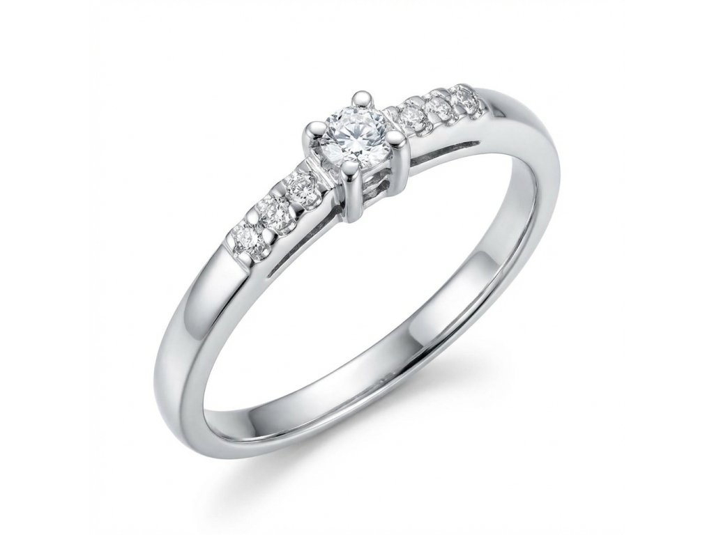 Zlatý prsten s diamanty v bílém 14ti karátovém zlatě ryzosti 585/1000. Průměr ozdoby je 3mm, šíře horní části prstenu 2.0mm, šíře spodní části prstenu – šíny 1.7mm, váha 1.50g (vel. 51)
