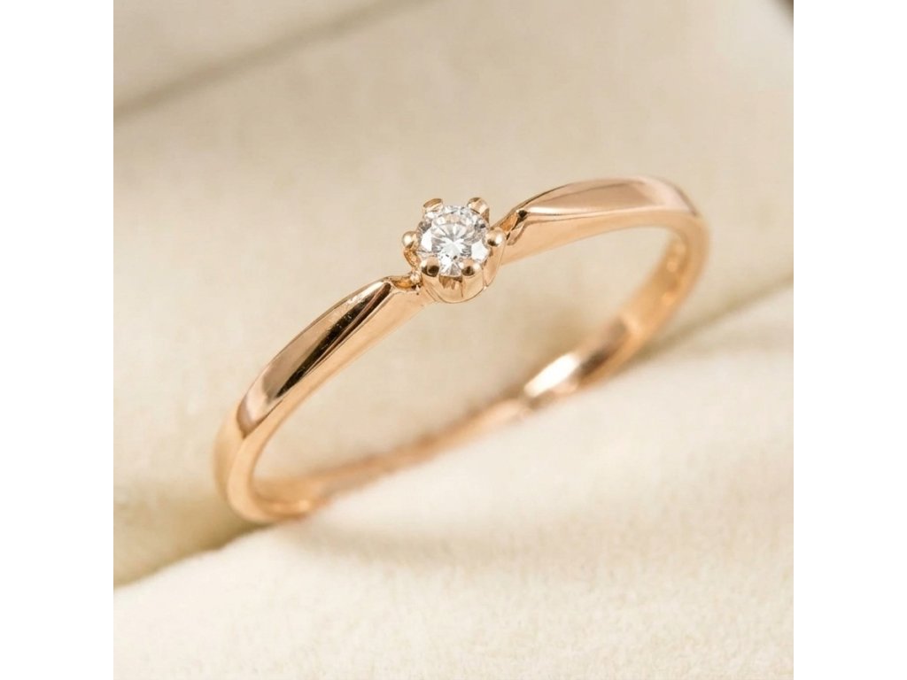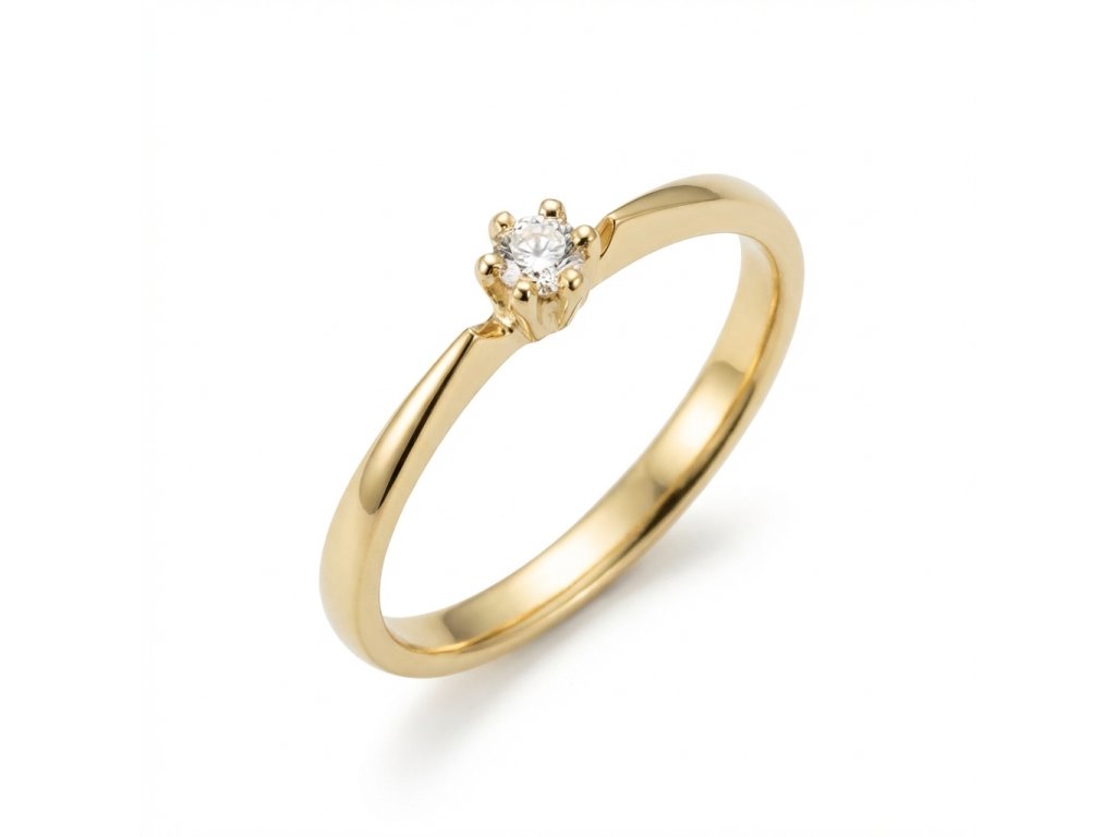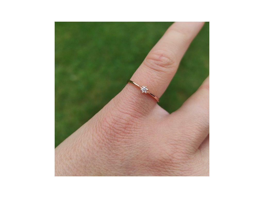 Zlatý dámský prsten s briliantem ve žlutém 14ti karátovém zlatě ryzosti 585/1000 ve velikosti 52. Šířka ozdoby je 3mm, šířka prstenu ve spodní části 1.8mm, váha +/- 1.80g.