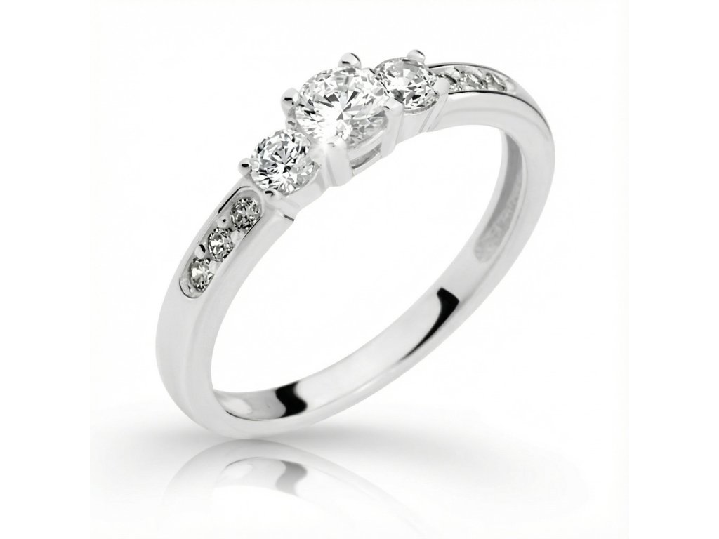 Zlatý dámský prsten se zirkony v bílém 14ti karátovém zlatě ryzosti 585/1000. Průměr středového kamene je 4mm, šíře spodní části prstenu – šíny 2mm, váha +/- 2.20g.