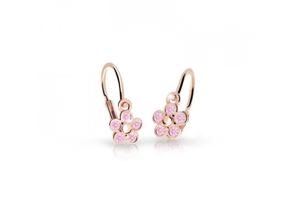 Dětské zlaté náušnice ve tvaru kytičky v růžovém14ti karátovém zlatě ryzosti 585/1000. Průměr ozdoby je 5.5mm, délka patentu 13.5mm, váha +/- 0.95g.