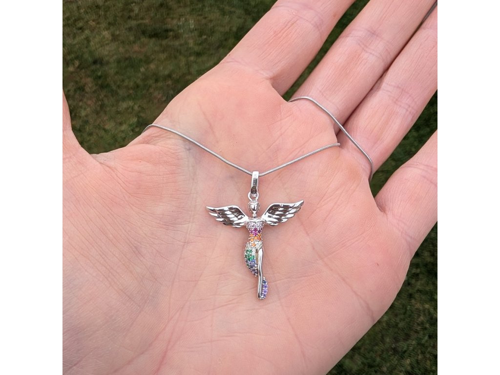 Stříbrný přívěsek ve tvaru anděla posetý barevnými kamínky.
