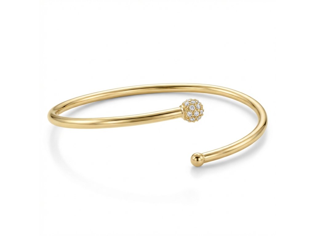 Zlatý luxusní dámský náramek pevný kruh se zirkonovou ozdobou na jednom konci a kuličkou na druhém konci ve žlutém 14ti karátovém zlatě ryzosti 585/1000.
