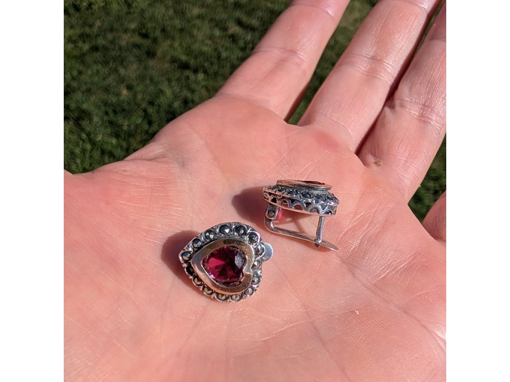 Stříbrné náušnice se srdcem z křišťálu (barvený křišťál barvy rubínu) z portugalského stříbra ryzosti 925/1000 na francouzský patent. Rozměr ozdoby je 14x15mm, délka patentu 12mm, váha 5.35. Náušnice jsou zdobeny pravými kamínky markazity a růžovým zlacením kolem kamene.