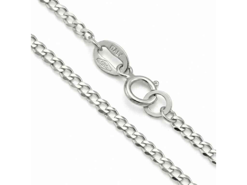 Zlatý řetízek typu pancer v bílém 14ti karátovém zlatě ryzosti 585/1000 o délce 50 cm n a zápon SK kroužek. Řetízek je plný typ o šíři 1.7mm, váha 2.55g.