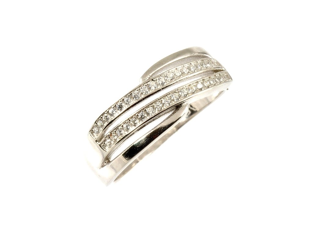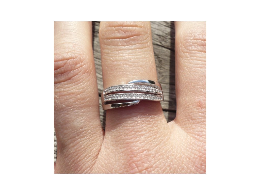Stříbrný prsten se 2 řadami zirkonů ve velikosti 62. Šíře ozdoby je 8mm, šíře spodní části prstenu – šíny 1.8mm. Prsten je ryzosti 925/1000 rhodiovaný, v barvě bílého zlata.