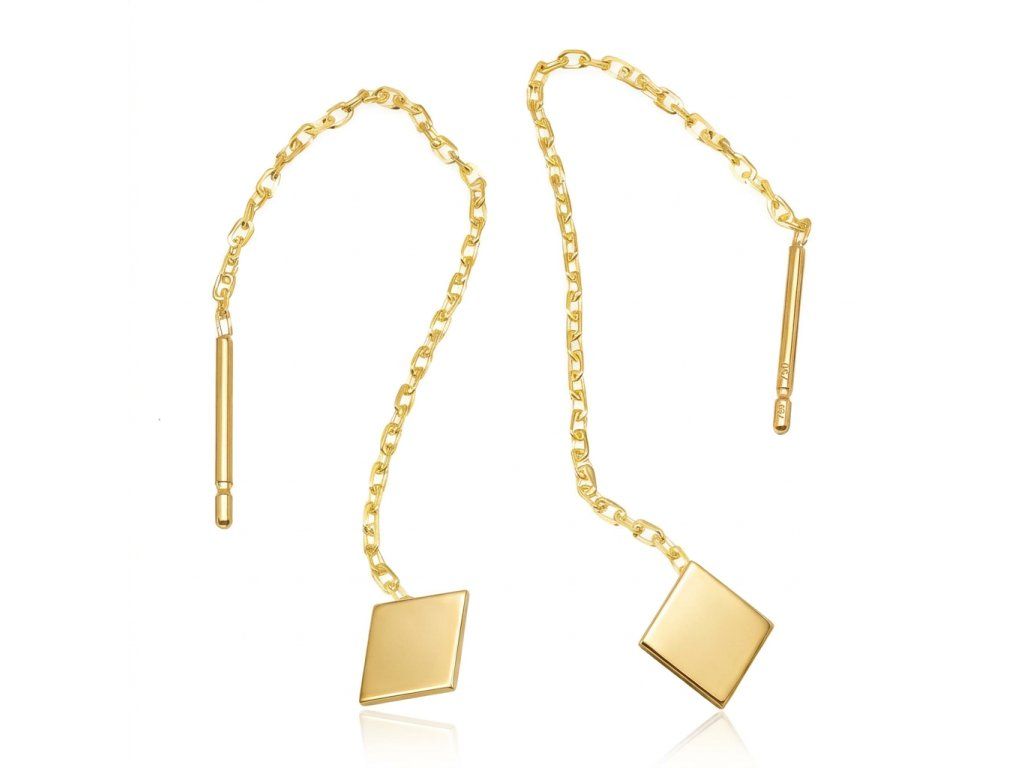 Zlaté provlékací řetízkové náušnice se čtverečkem ve žlutém 14ti karátovém zlatě ryzosti 585/1000. Celková délka náušnice je 6cm, rozměr ozdoby v uchu 5x5mm, váha 0.75g.