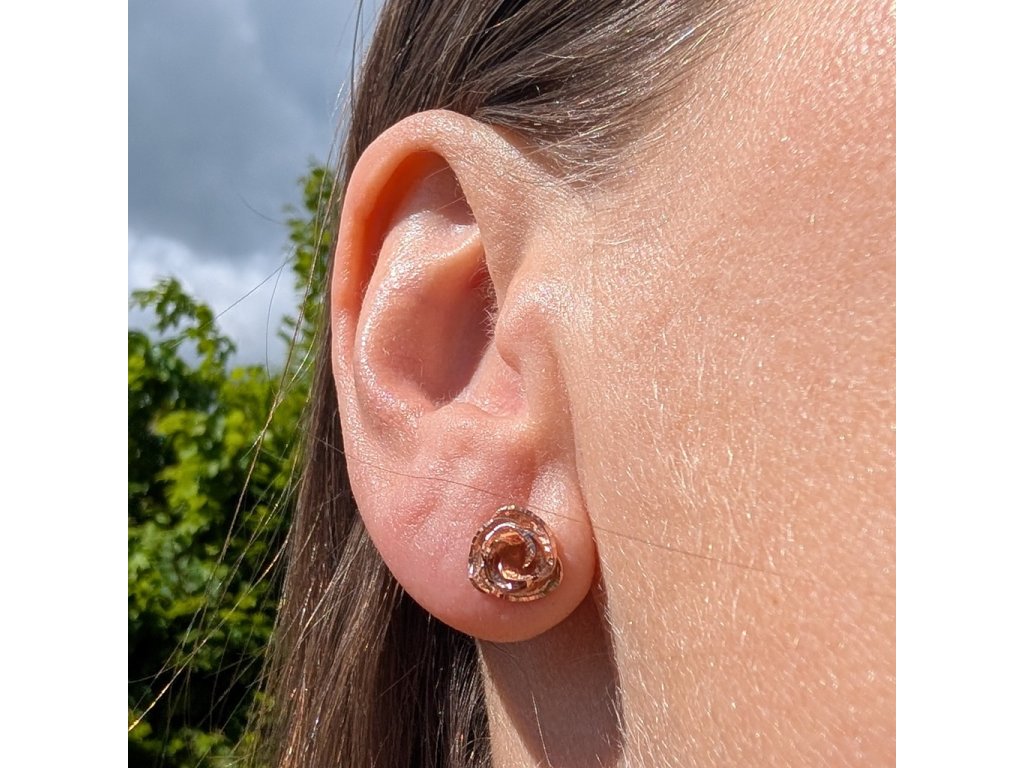 Zlaté náušnice ve tvaru růže v růžovém 14ti karátovém zlatě ryzosti 585/1000 na puzetový zápon. Průměr ozdoby je 9mm, váha 1.60g.