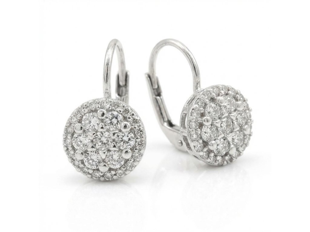 Zlaté dámské náušnice zdobené bílým zirkonem v bílém 14ti karátovém zlatě ryzosti 585/1000 na patentový zápon, průměr ozdoby 9mm, délka patentu 13mm, váha 2.85g.