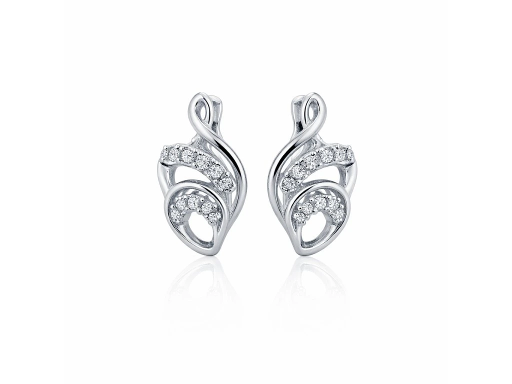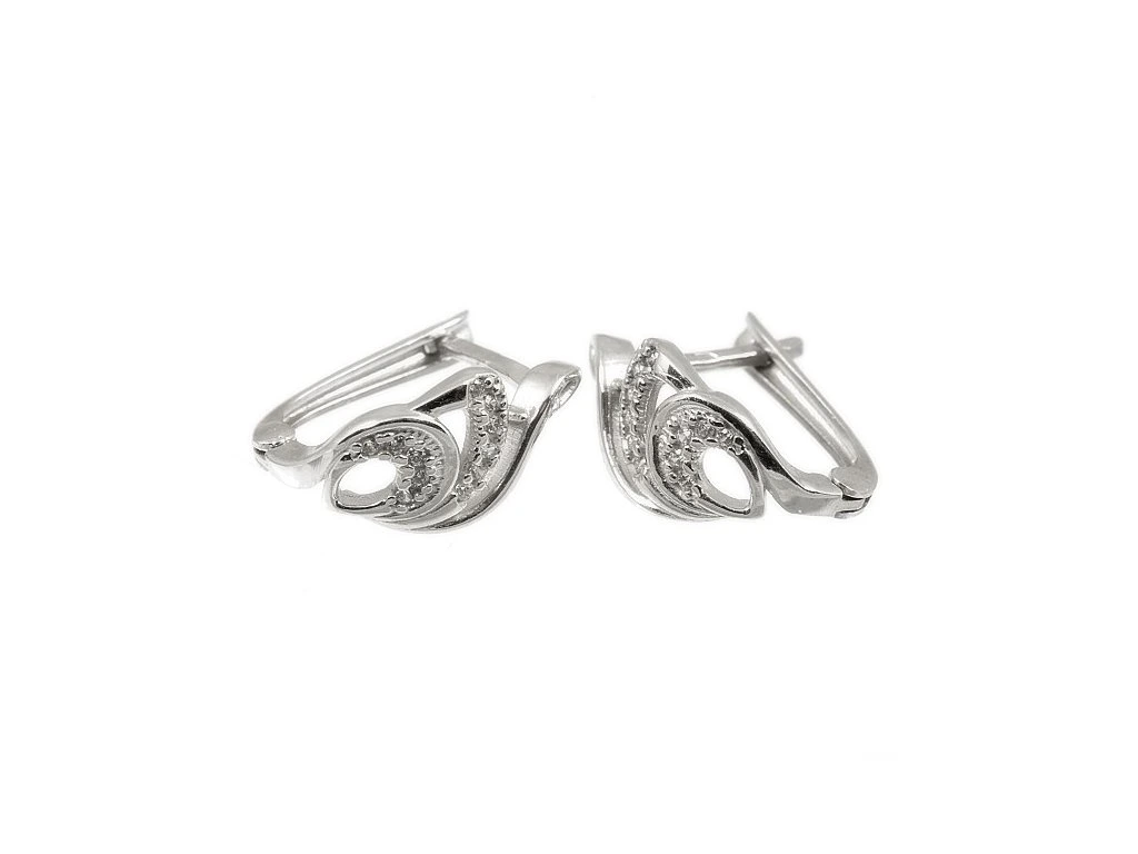 Zlaté dámské zlaté náušnice s bílými zirkony v bílém 14ti karátovém zlatě ryzosti 585/1000 na francouzský zápon. Rozměr ozdoby je 14x7mm, délka patentu 12.5mm, váha 2.42g.