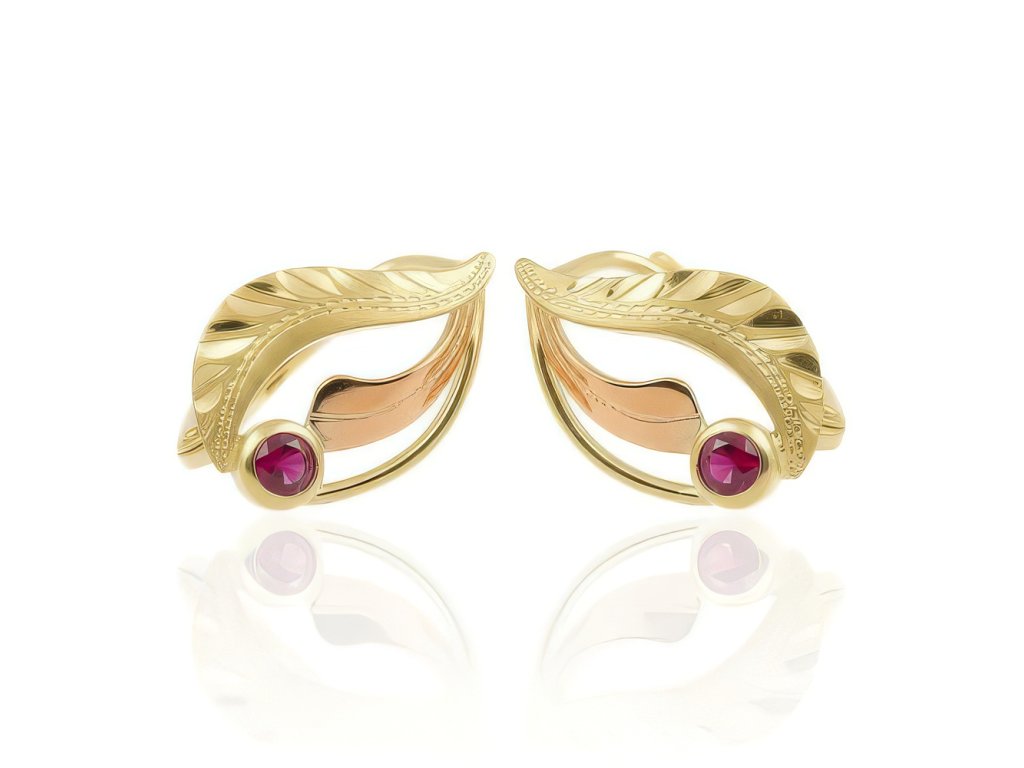 Zlaté dámské náušnice s rubínem v kombinaci žlutého a červeného zlata.