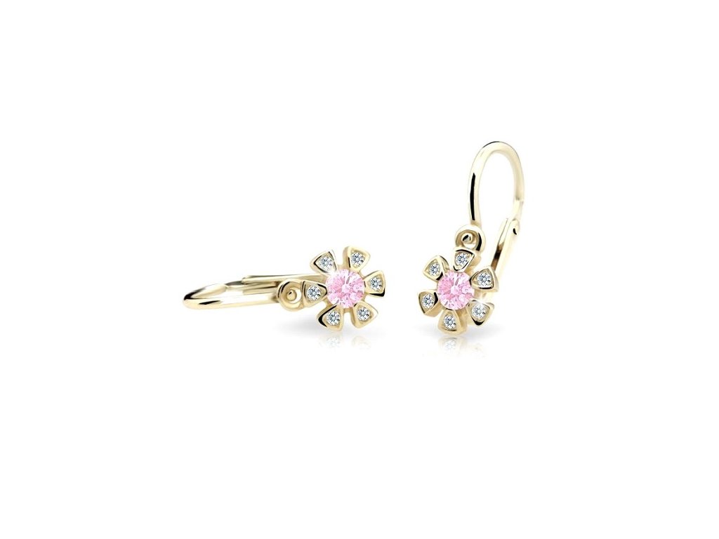 Zlaté dětské náušnice se světle růžovým kamínkem (pink) ve žlutém14ti karátovém zlatě ryzosti 585/1000 na dětský přední zápon tzv. brizuru. Průměr ozdoby je 6mm, délka patentu 14mm, hmotnost +/-1.05g.