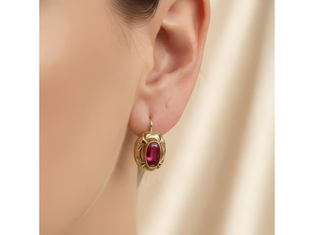 Zlaté klasické náušnice s rubínem (syntetickým) v kombinaci žlutého a červeného zlata ryzosti 585/1000 na patentový zápon. Rozměr ozdoby je 15x12mm, rozměr kamene 10x5mm, čistá váha zlata - netto +/- 3.70g, brutto +/-4.40g, délka patentu 20mm. Doporučujeme zakoupit přívěsek nebo prsten do soupravy.