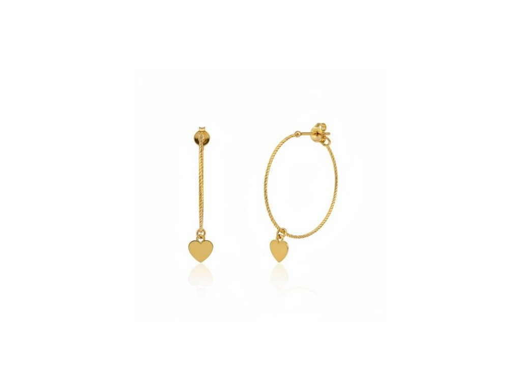 Zlaté tenké kruhy o průměru 3cm zdobené srdíčkem ve žlutém 14ti karátovém zlatě ryzosti 585/1000 na puzetový zápon. Šířka kruhu je 0.7mm, váha 1.65g.