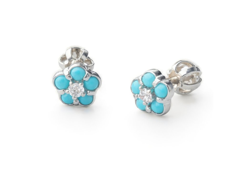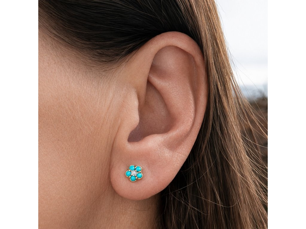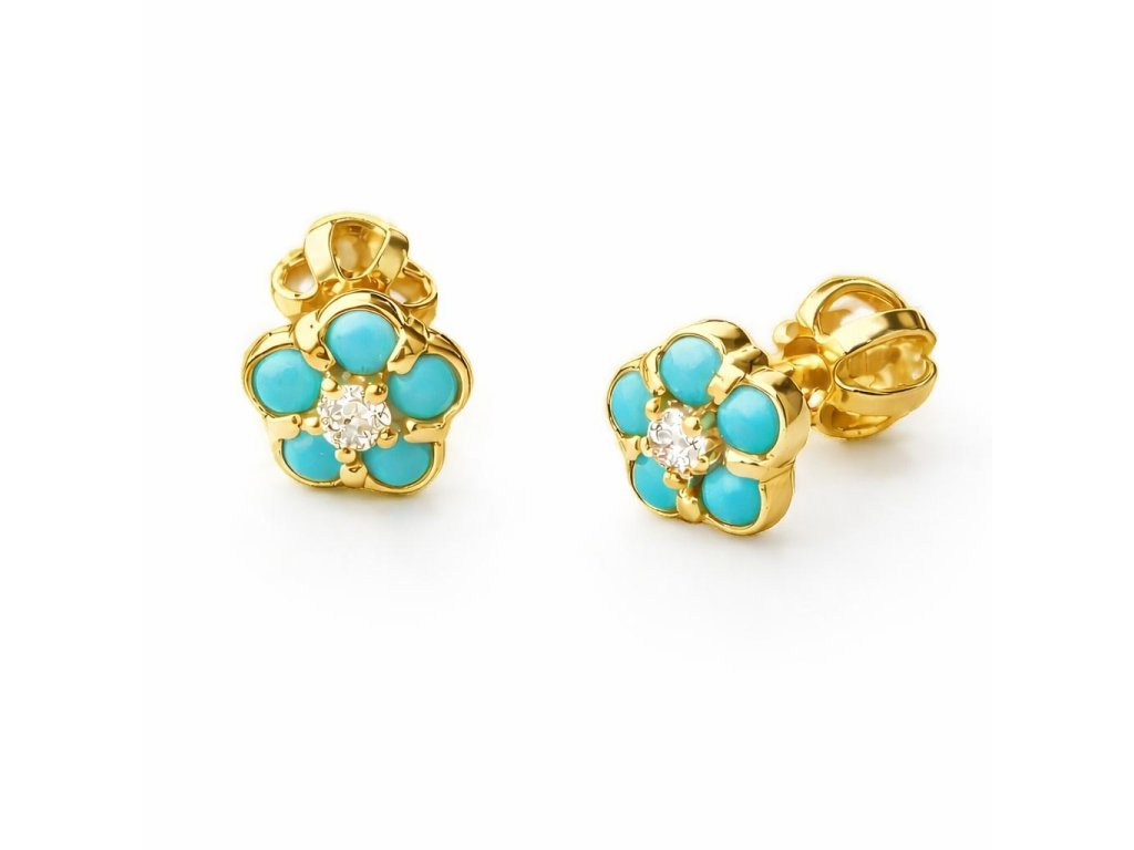 Zlaté náušnice pomněnky s přírodním tyrkysem ve žlutém/bílém 14ti karátovém zlatě ryzosti 585/1000 na šroubovací zápon.