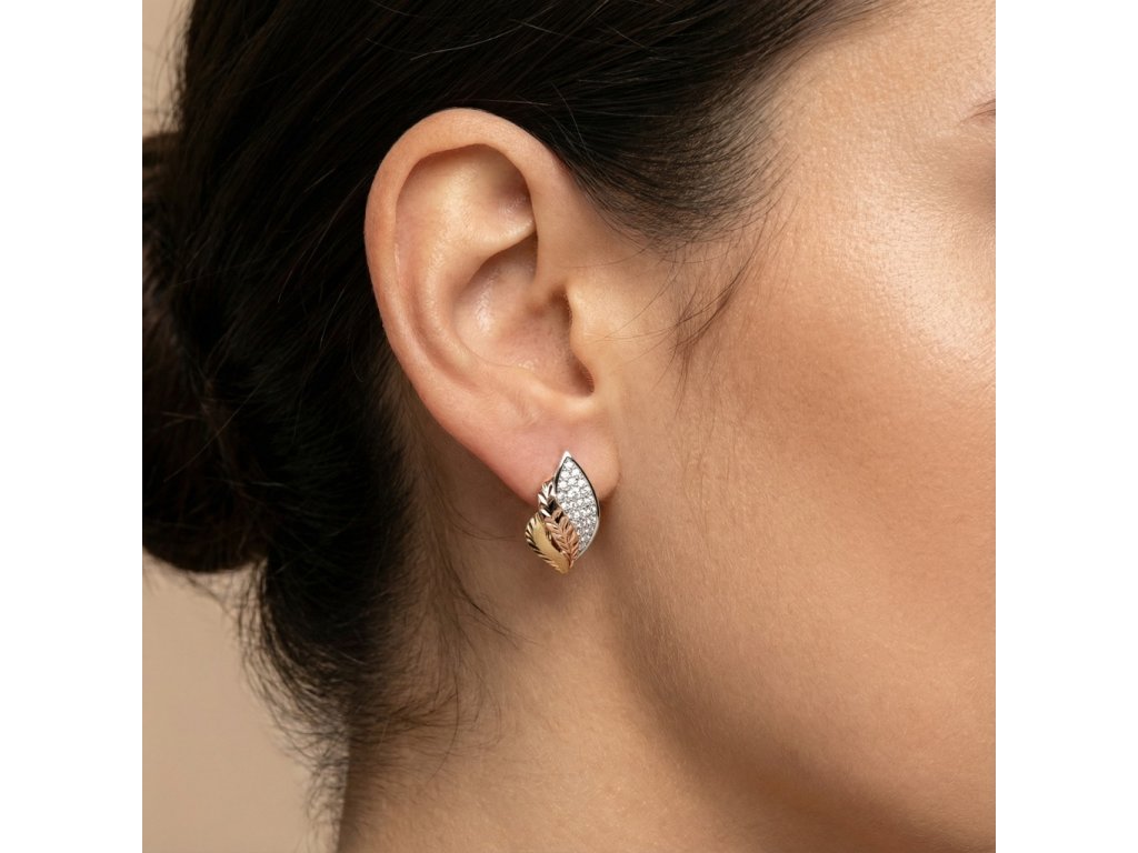 Zlaté luxusní náušnice s brilianty v kombinaci žlutého, bílého a červeného 14ti karátového zlata ryzosti 585/1000 na patentový zápon. Rozměr náušnice je 18x11mm, délka patentu 15mm, +/- váha 2.90g.