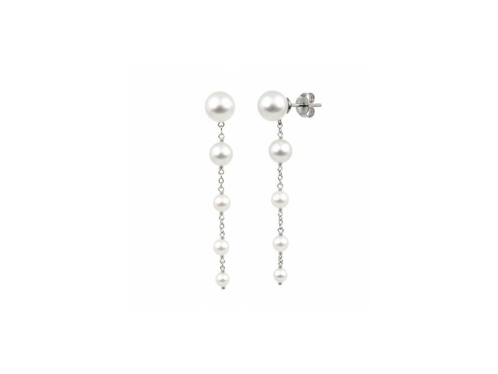 Zlaté visací náušnice se sladkovodními perličkami v bílém 14ti karátovém zlatě ryzosti 585/1000 na puzetový zápon. Průměr perly je 8 (max) a 3.7 (min) mm, celková délka 5.5cm, váha 3.75g.