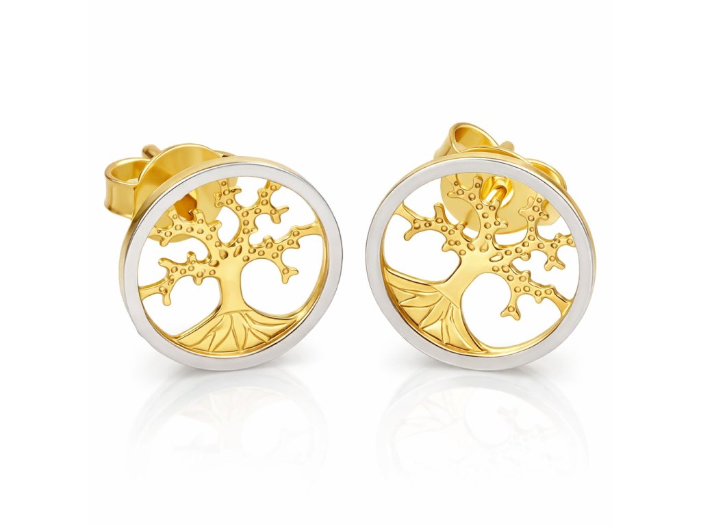 Zlaté dámské náušnice ve tvaru stromu života v kombinaci žlutého a bílého zlata.