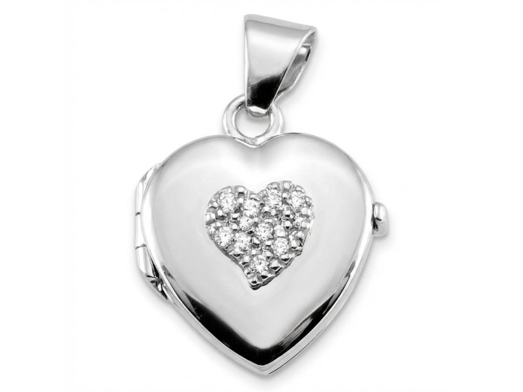 Zlatý otevírací medailonek srdce v bílém zlatě zdobený zirkony