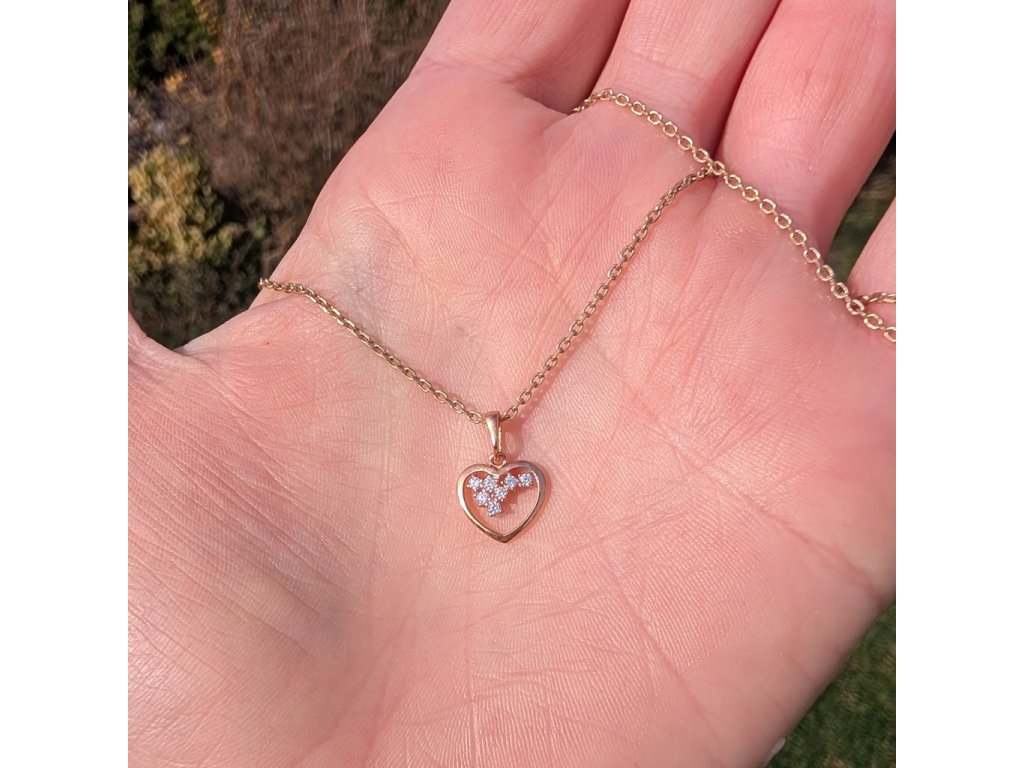 Zlaté drobné srdíčko zdobené čirými zirkony v růžovém 14ti karátovém zlatě ryzosti 585/1000 o rozměru 10x11mm, hmotnost +/- 0.60g.
