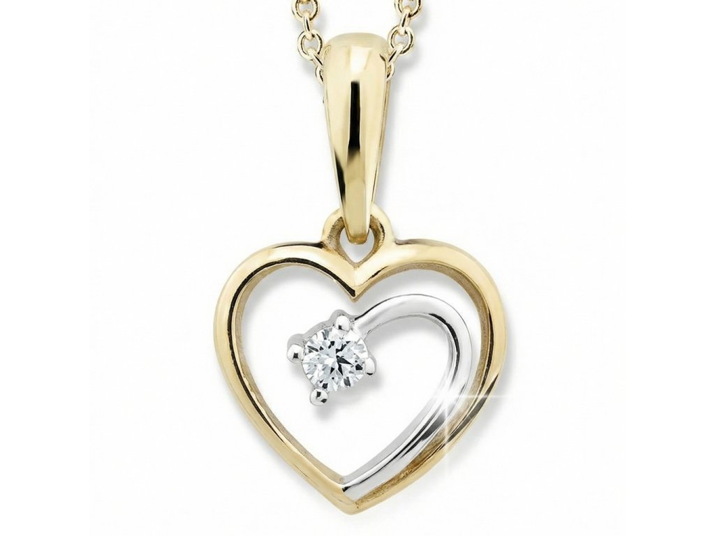 Zlaté srdíčko se zirkonem v kombinaci žlutého a bílého 14ti karátového zlata ryzosti 585/1000. Rozměr přívěsku je 11x12mm, celková délka 17mm, váha 0.83g