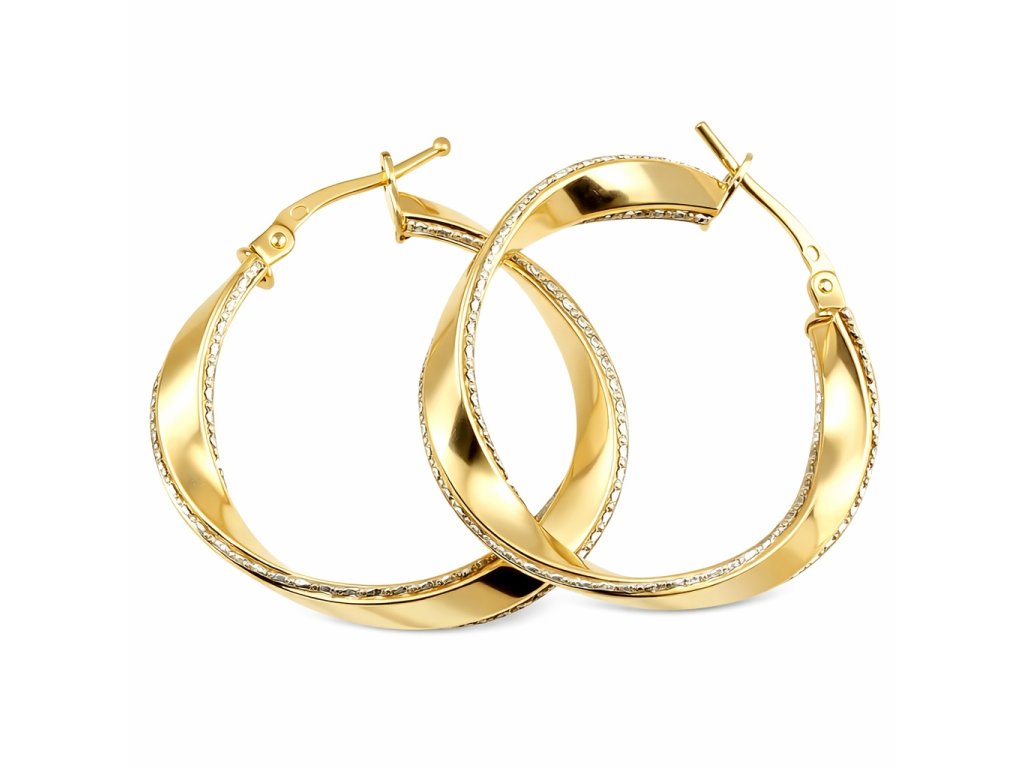 Zlaté dámské náušnice kruhy v kombinaci žlutého a bílého 14ti karátového zlata ryzosti 585/1000 o průměru 2.7cm a šíři 4mm, váha 2.62g.