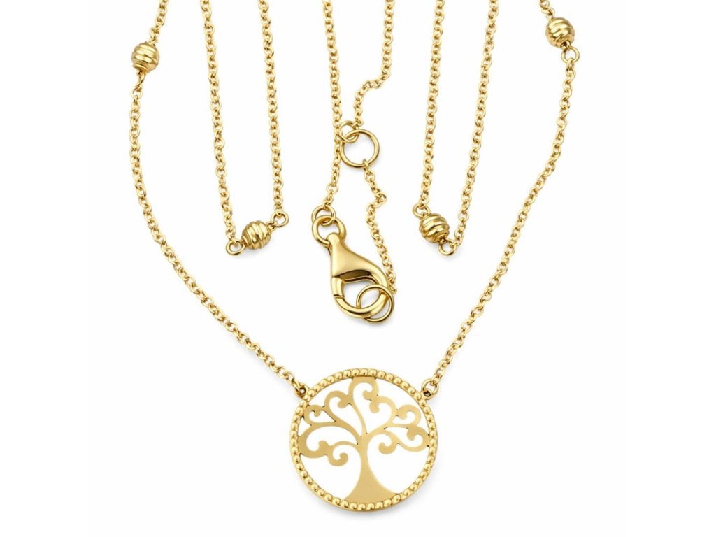 Zlatý dámský náhrdelník se symbolem strom života ve žlutém 14ti karátovém zlatě ryzosti 585/1000 o nastavitelné délce 43+2cm. Průměr ozdoby je 1.5cm, šíře řetízku typu ankder 1.3mm, váha 2.65g, karabinový zápon.