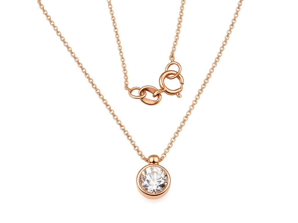 Zlatý náhrdelník s čirým zirkonem v růžovém 14ti karátovém zlatě ryzosti 585/1000 o nastavitelné délce 42+3cm. Průměr ozdoby je 6mm, řetízek typu anker o šíři 0.6mm, zápon SK kroužek, váha 1.55g.