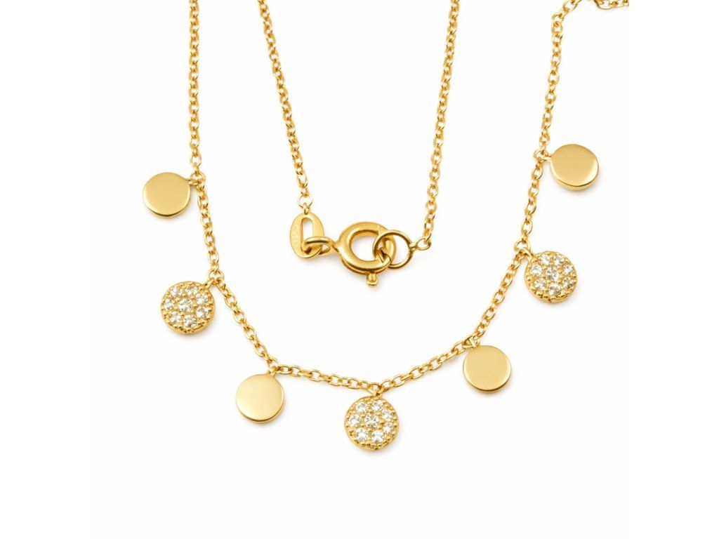 Zlatý dámský náhrdelník s ozdobami ve žlutém 14ti karátovém zlatě ryzosti 585/1000 o nastavitelné délce 42+3cm na zápon SK kroužek. Průměr kulaté ozdoby je 4.3mm, šíře řetízku anker 1mm, váha 2.85g. Každý druhý kruhový přívěsek je zdoben čirými zirkony.