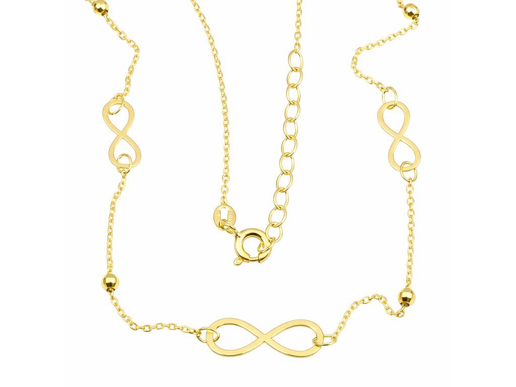 Zlatý dámský náhrdelník se symbolem nekonečno a kuličkami ve žlutém 14ti karátovém zlatě ryzosti 585/1000 o nastavitelné délce 42+3cm. Rozměr ozdoby je 16x6mm, šíře řetízku 1mm, váha 1.75g, zápon SK kroužek.