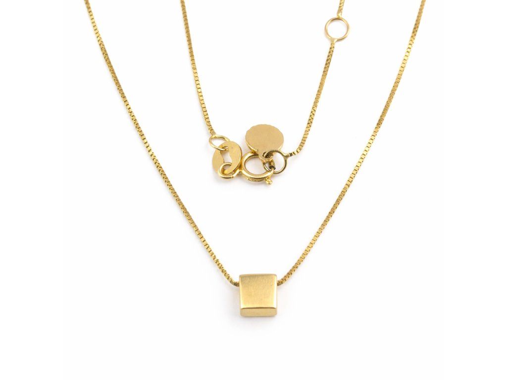 Zlatý náhrdelník s malou čtvercovou ozdobou ve žlutém 14ti karátovém zlatě ryzosti 585/1000 o nastavitelné délce 42+3cm. Rozměr ozdoby je 5x5mm, váha 1.77g. Řetízek je typu kostičky o šíři 0.8 mm na zápon SK kroužek.