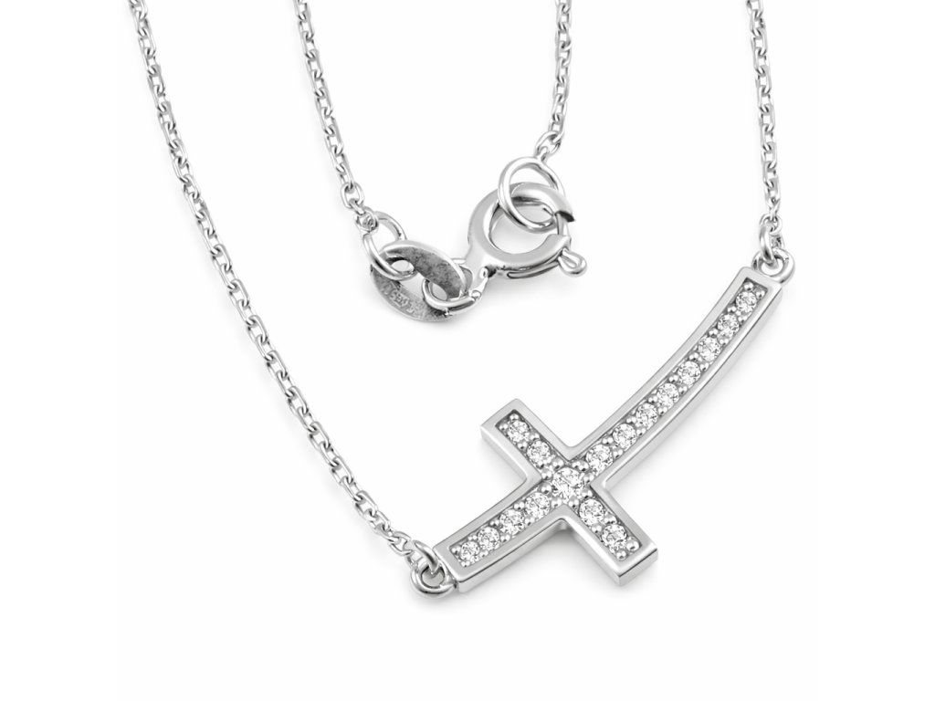 Zlatý dámský náhrdelník s křížkem v bílém 14ti karátovém zlatě ryzosti 585/1000 o nastavitelné délce 42+2cm na zápon SK kroužek. Rozměr křížku je 22x10mm (šíře ramene 2.6mm), šíře řetízku 0.7mm, váha 2.45g. Křížek je zdoben bílými zirkony.