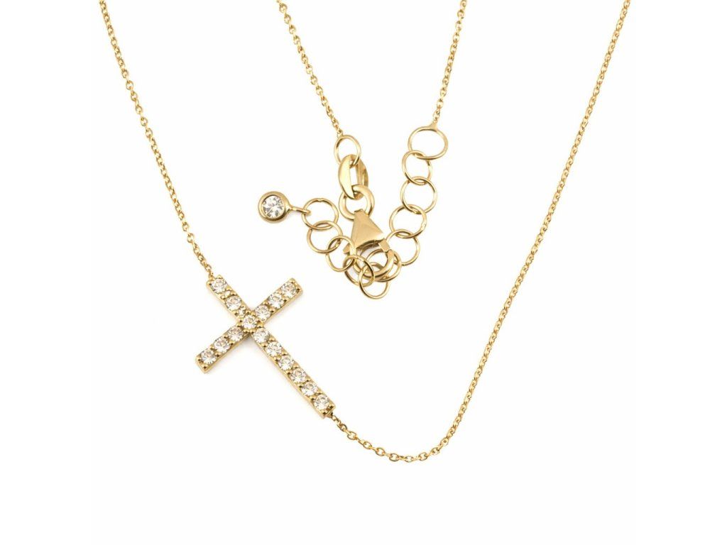 Zlatý náhrdelník s křížkem se zirkony ve žlutém 14ti karátovém zlatě ryzosti 585/1000 v nastavitelné délce 42+3cm na karabinový zápon. Rozměr křížku je 18x12mm, šíře ramene 1.8mm, celková váha 2.25g.