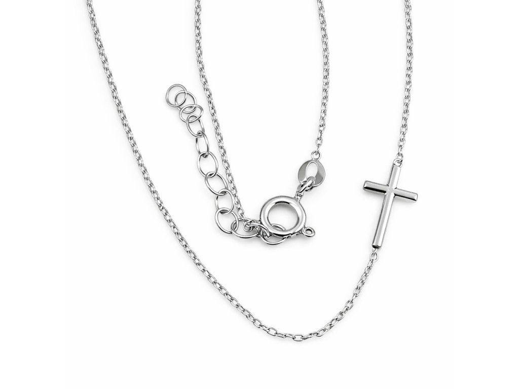 Zlatý dámský náhrdelník s křížkem v bílém 14ti karátovém zlatě ryzosti 585/1000 o nastavitelné délce 42+3cm. Rozměr křížku je 13x6mm, zápon SK kroužek, celková váha 1.62g. Řetízek typu anker o šíři 0.8mm.