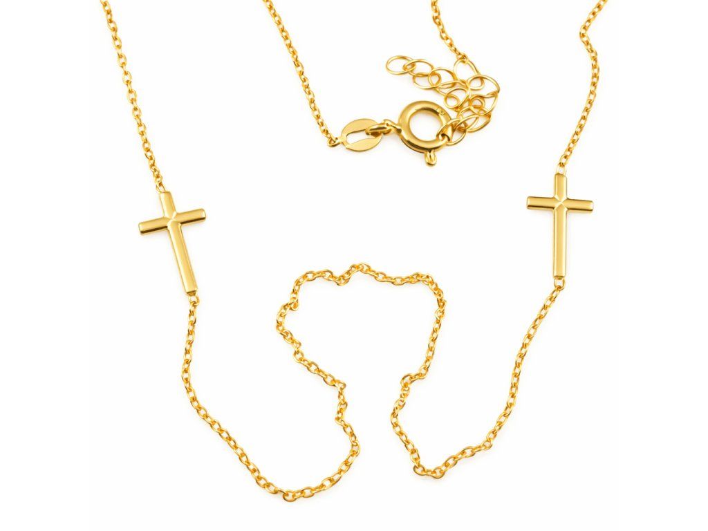 Zlatý dámský náhrdelník s křížky ve žlutém 14ti karátovém zlatě ryzosti 585/1000 o nastavitelné délce 42+3cm na karabinový zápon. Šíře řetízku je 1mm, pevný typu anker, rozměr křížku 10x6mm, váha 1.90g.