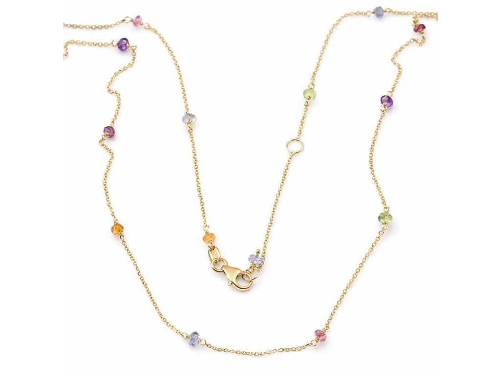 Zlatý dámský náhrdelník zdobený malými přírodními kamínky (ametyst, safír, turmalín, smaragd) ve žlutém 14ti karátovém zlatě ryzosti 585/1000 o nastavitelné délce 42+3cm na karabinový zápon.