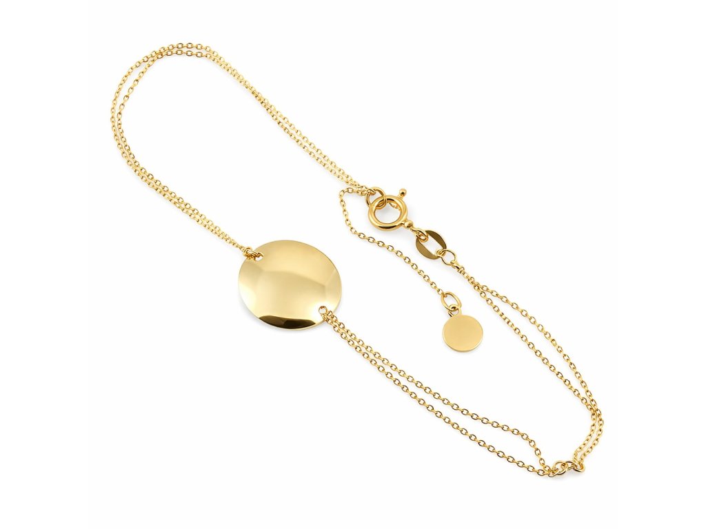 Zlatý dámský náramek s kulatou destičkou ve žlutém 14ti karátovém zlatě ryzosti 585/1000 o nastavitelné délce 17 a 20cm na zápon SK kroužřek. Průměr ozdoby je 12mm, váha 1.45g, řetízek je dvojitý o šíři 0.9mm.