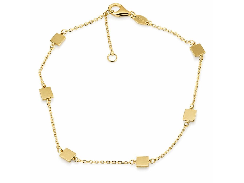 Zlatý dámský náramek se čtverečky ve žlutém 14ti karátovém zlatě ryzosti 585/1000 o nastavitelné délce 17+2cm na karabinový zápon. Rozměr ozdoby je 4x4mm, šíře řetízku typu anker 1mm, váha 1.40g.