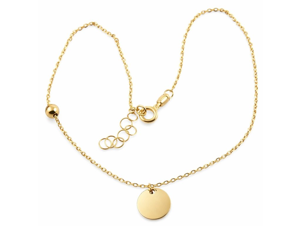 Zlatý dámský náramek na nohu v kombinaci žlutého a bílého 14ti karátového zlata ryzosti 585/1000 o nastavitelné délce 24+2cm, váha 1.52g, zápon SK kroužek. Řetízek je typu anker o šíři 1.1mm, průměr destičky 9mm, zlatá kulička průměr 4mm.