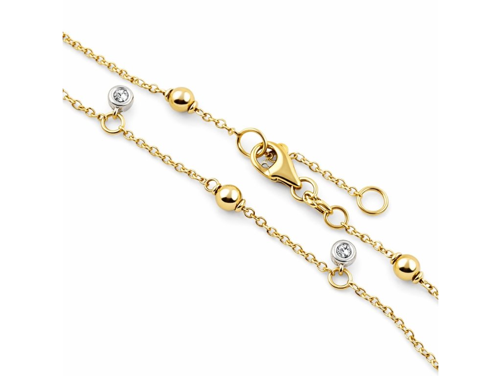 Zlatý dámský náramek v kombinaci žlutého a bílého 14ti karátového zlata ryzosti 585/1000 o nastavitelné délce 16.5+2cm. Řetízek je typu anker o šíři 1mm, průměr kuličky 3mm, průměr zirkonu 3mm, váha 1.70g, karabinový zápon.