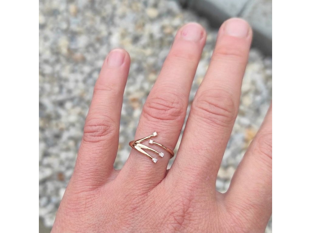 Zlatý dámský prsten v růžovém 14ti karátovém zlatě ryzosti 585/1000 zdobený 4ks malých čirých zirkonů. Celková šíře prstenu je 11.5mm, šíře spodní části prstenu - šíny 2.2mm, váha +/- 2.00g.