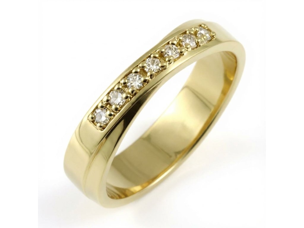 Zlatý dámský prsten s přírodními brilianty ve žlutém 14ti karátovém zlatě ryzosti 585/100. Šíře prstenu je 4mm jak ve spodní části prstenu tzv. šíny, tak ozdoby, která je tvořena 2 částmi o šíři 2x2mm. Prsten ve velikosti 54 váží 3.70g.