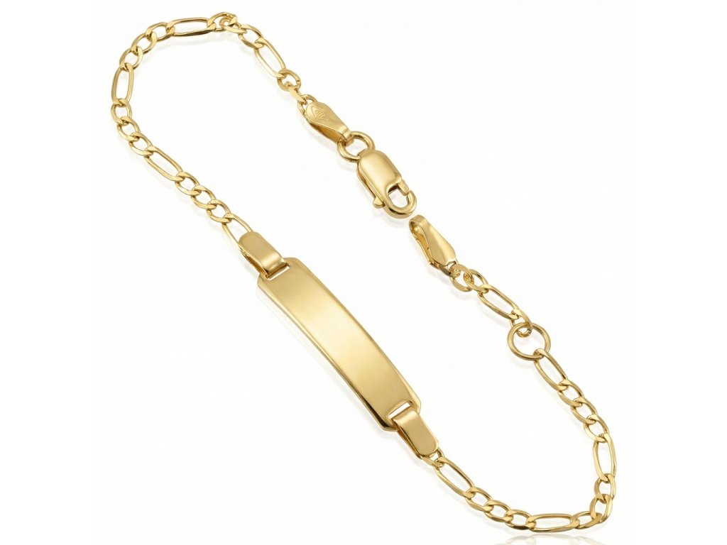 Zlatý dětský náramek s destičkou ve žlutém 14ti karátovém zlatě ryzosti 585/1000 v nastavitelné délce 13+2cm na karabinový zápon. Rozměr destičky je 5x21mm, šíře řetízku 2mm, váha 2.0g.