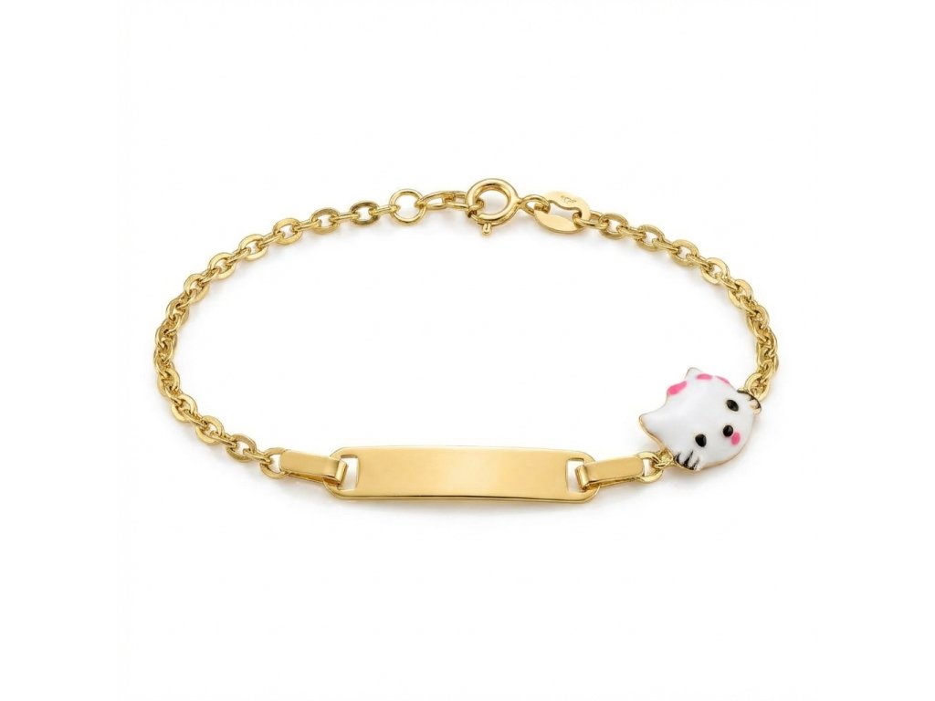 Zlatý dětský náramek s Hello Kitty a destičkou ve žlutém 14ti karátovém zlatě ryzosti 585/1000 o nastavitelné délce 11.5 nebo 14cm na zápon SK kroužek. Rozměr destičky je 20x4mm, řetízek typu anker o šíři 1.3mm, váha 1.15g.