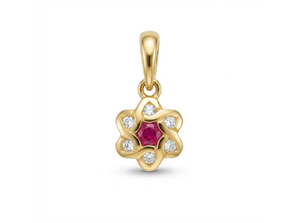 Zlatý dětský přívěsek s červeným kamínkem rubin ve žlutém 14ti karátovém zlatě ryzosti 585/1000 o průměru 5mm. Hmotnost přívěsku je +/-0.45g. Doporučujeme zakoupit náušnice do soupravy.